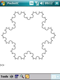 PocketLogo has some special features: – You can define “walls” which are impossible to cross for the turtle (an error is thrown as if the turtle was in “fence mode” and tried to walk out of the screen area). There is a command that returns the distance to the nearest wall in the turtles viewing direction. – The turtle can take and lay down objects (apples). There is a command that returns the number of apples in the turtle’s reach. – PocketLogo can process deterministic context-free Lindenmayer systems with or without a stack memory. It translates them into a recursive Logo program that draws the image deduced from the L-system (e.g. the koch curve), or alternatively into the word that is derived from the axiom after an indicated number of iterations. – It is possible to display the syntax tree used by PocketLogo to interpret the Logo program.