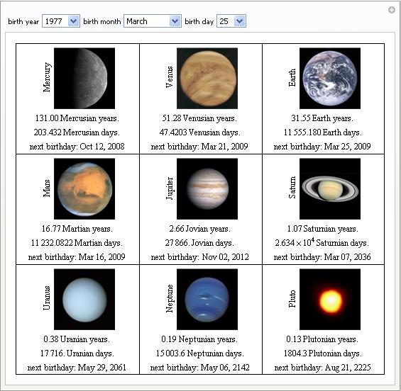 The problem you are now faced with is working out when your next Martian birthday is. That’s where this Wolfram Demonstration from Chris Boucher comes in handy. Simply enter your birthdate and you’ll instantly get told your age as it would be on the various planets of the solar system. Despite it’s recent demotion from planetary status, Pluto has been included as well, and rightly so in my opinion. As an added bonus you’ll get told when your next birthday will be on each planet – helping you to fill up that all important celebration calendar. Cheers!